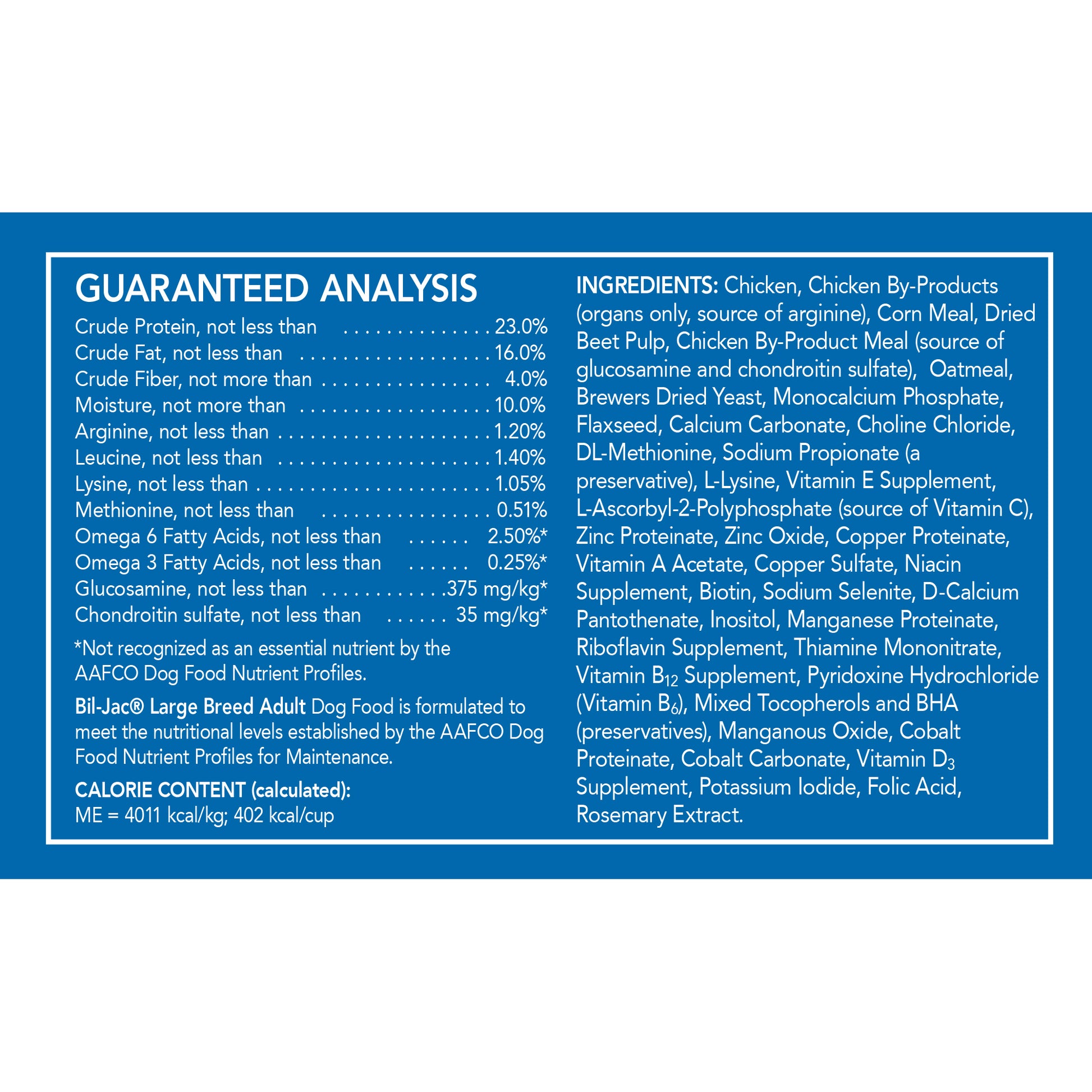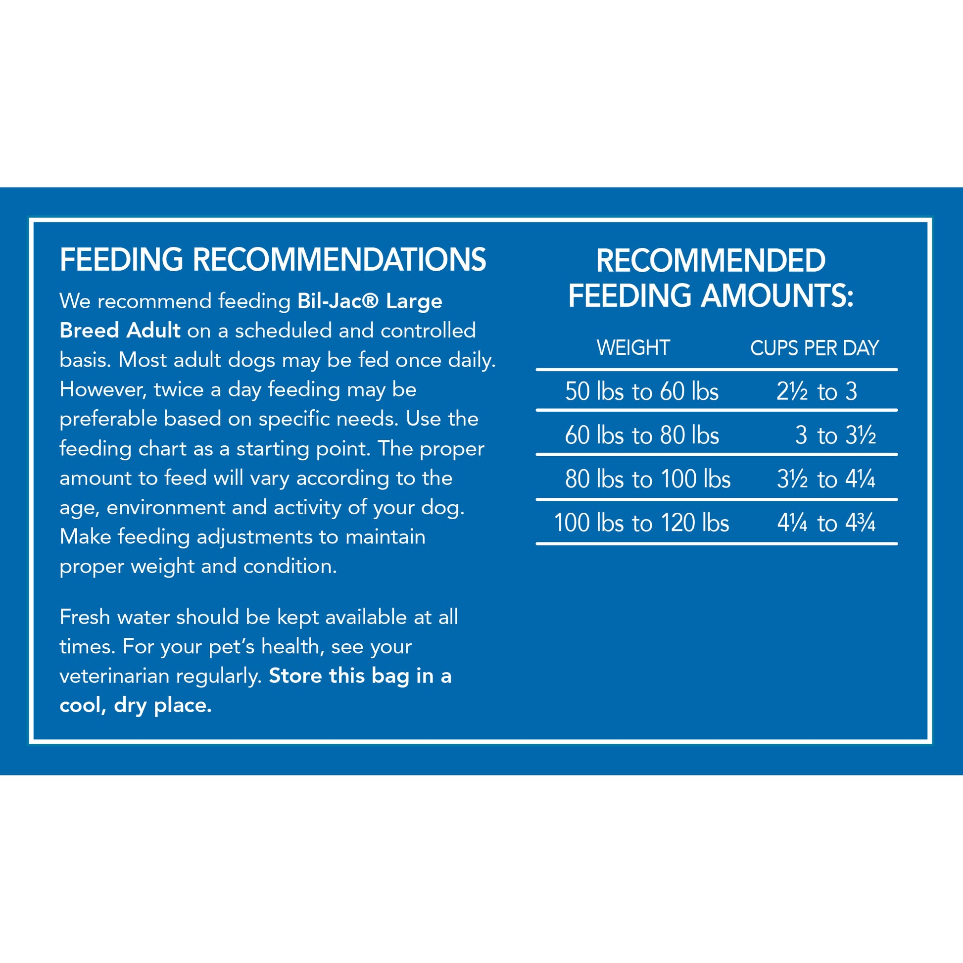 Recomendamos alimentar Bil-Jac® Large Breed Adult de forma programada y controlada. La mayoría de los perros adultos pueden ser alimentados una vez al día. Sin embargo, puede ser preferible alimentarlo dos veces al día según las necesidades específicas. Utilice la tabla de alimentación como punto de partida. La cantidad adecuada de alimento variará según el entorno y la actividad de su perro. Realice ajustes de alimentación para mantener el peso y la condición adecuados.