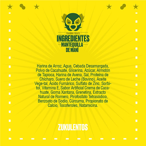 Harina de Arroz, Agua, Cebada Desamargada, Polvo de Cacahuate, Glicerina, Azúcar, Almidón de Tapioca, Harina de Avena, Sal, Proteína de Chícharo, Suero de Leche (Bovino), Aceite Vegetal, Ácido Fumárico, Sulfato de Zinc, Sorbitol, Vitamina E, Sabor Artificial Crema de Cacahuate, Goma Xantana, Grenetina, Extracto Natural de Romero, Pirofosfato Tetrasódico, Benzoato de Sodio, Cúrcuma, Propionato de Calcio, Tocoferoles, Natamicina.