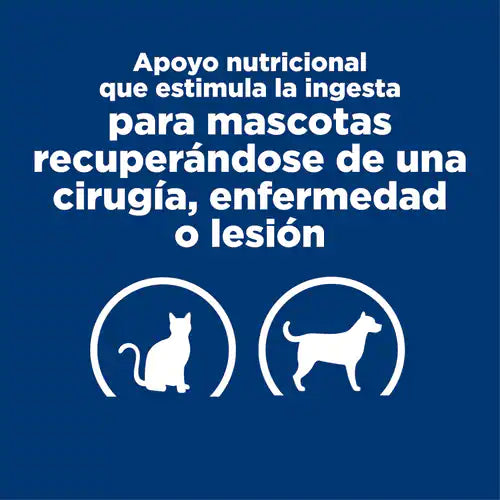 Máxima flexibilidad en la alimentación (a mano, tazón, cuchara, jeringa o sonda) para proporcionar los nutrientes esenciales que necesitan las mascotas en estado crítico