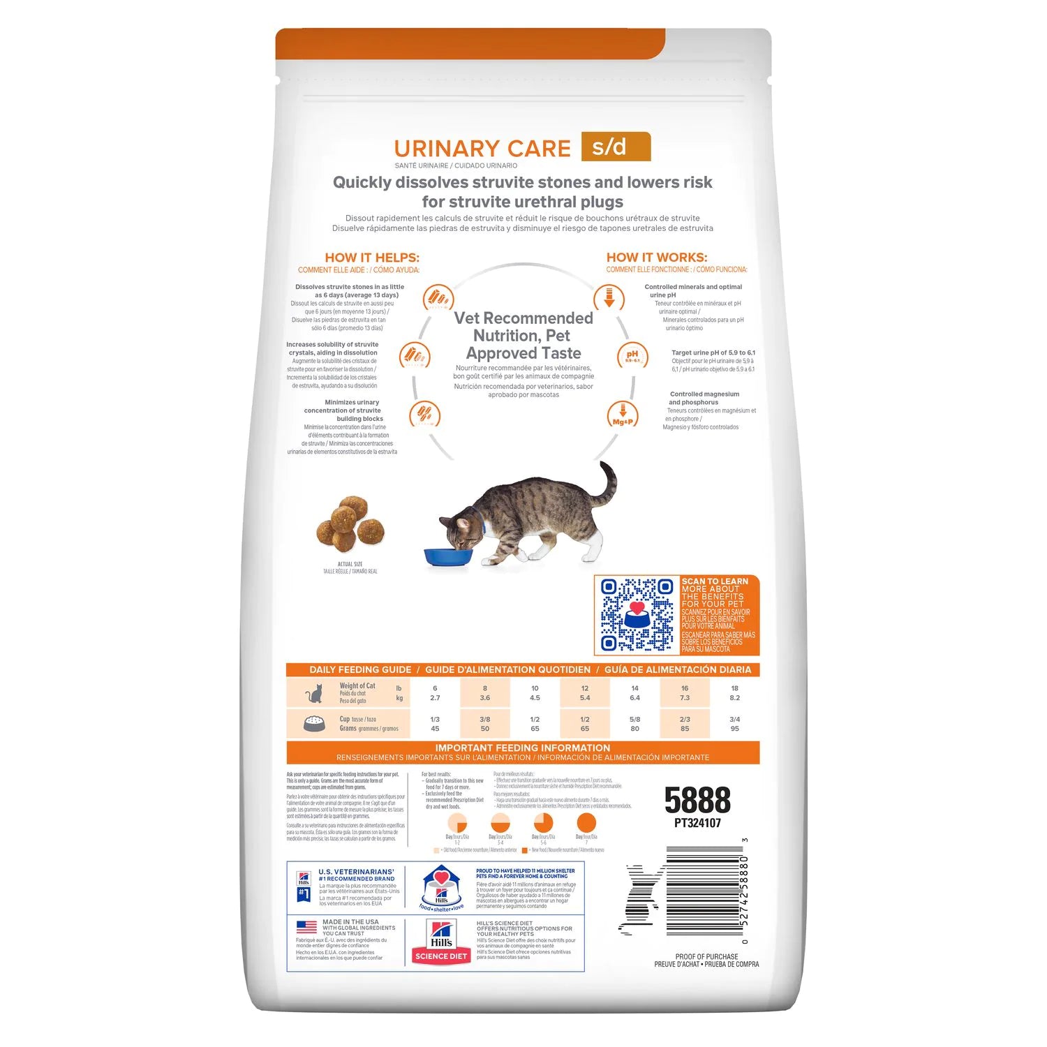 Nutricionistas & de Hill's Los veterinarios desarrollaron la nutrición clínica Prescription Diet s/d para apoyar la salud urinaria de un gato. De hecho, s/d está clínicamente probado para disolver cálculos de estruvita en tan solo 6 días (promedio de 13 días). Este alimento seco tiene sabor a pollo y un sabor irresistible que a los gatos les encanta.