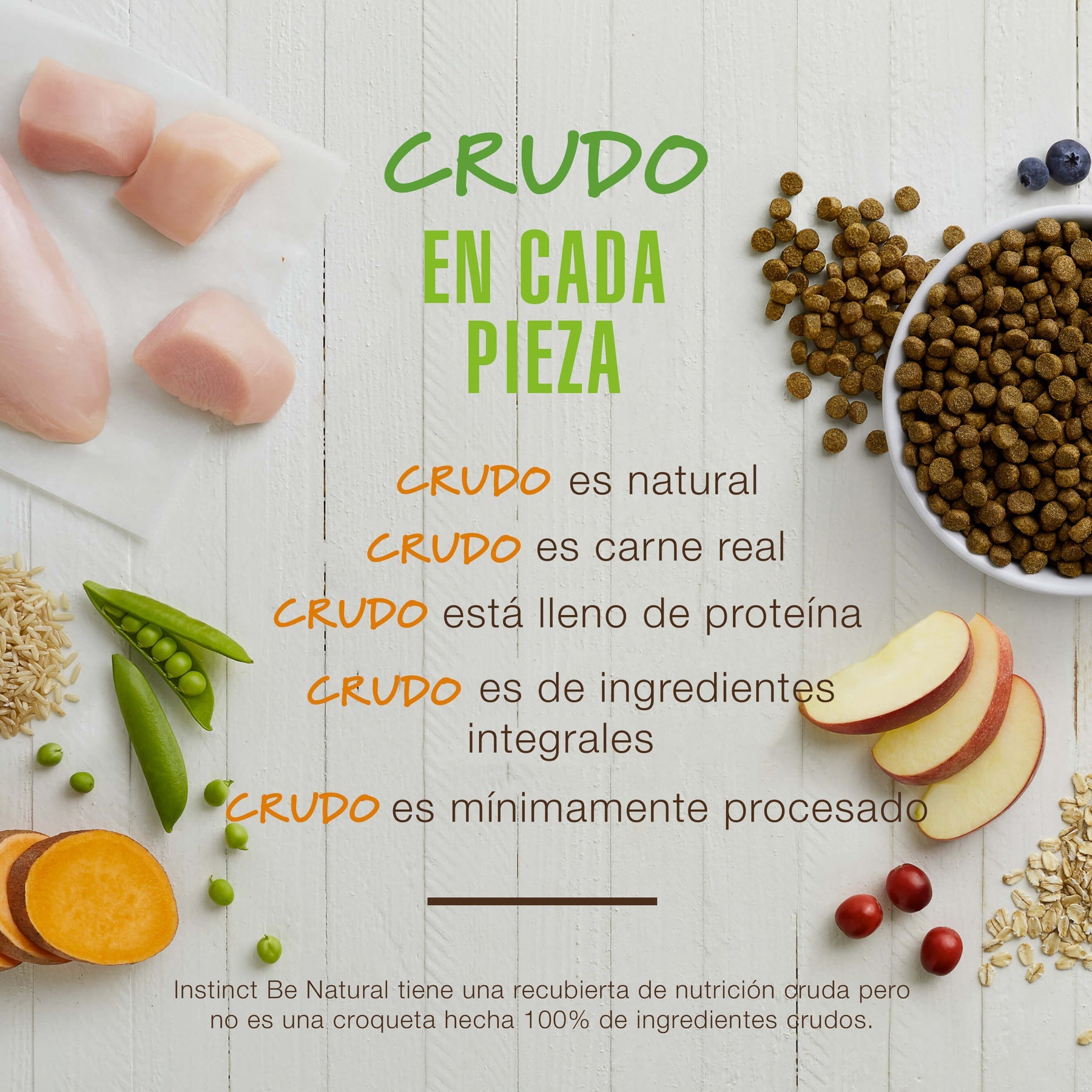 La nutrición natural comienza aquí. La receta Instinct® Be Natural ™ Real de pollo y arroz integral comienza con pollo sin jaulas y no contiene harina de relleno, maíz, trigo, soja o subproductos ni conservantes y colores artificiales. Guiados por nuestra creencia en el poder de la materia prima, cada pieza se revuelve con pollo crudo triturado liofilizado, elevando la barra en nutrición y sabor.