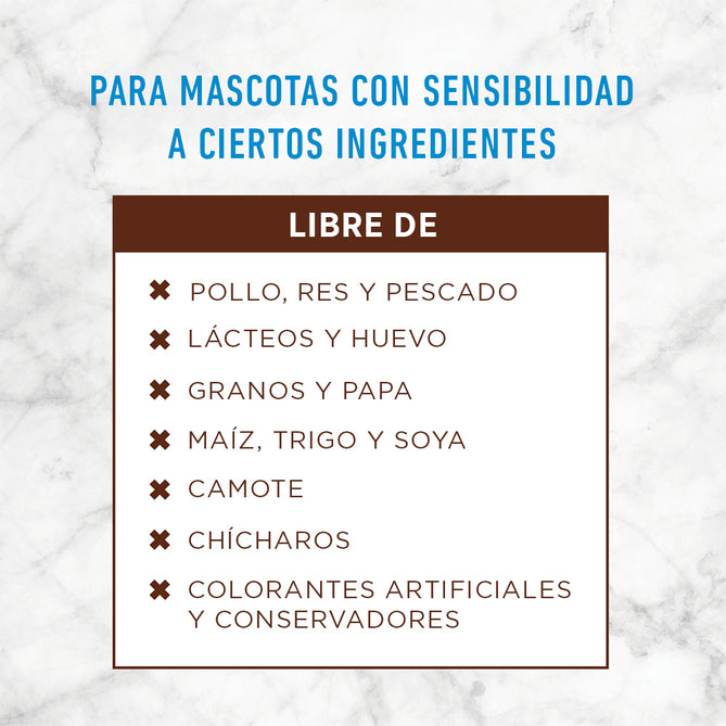 Cuando tu mascota tiene sensibilidad a ciertos alimentos, es importante saber exactamente qué hay en estos. Es por eso que nuestras listas de ingredientes son cortas, elaboradas con una proteína animal y una vegetal.