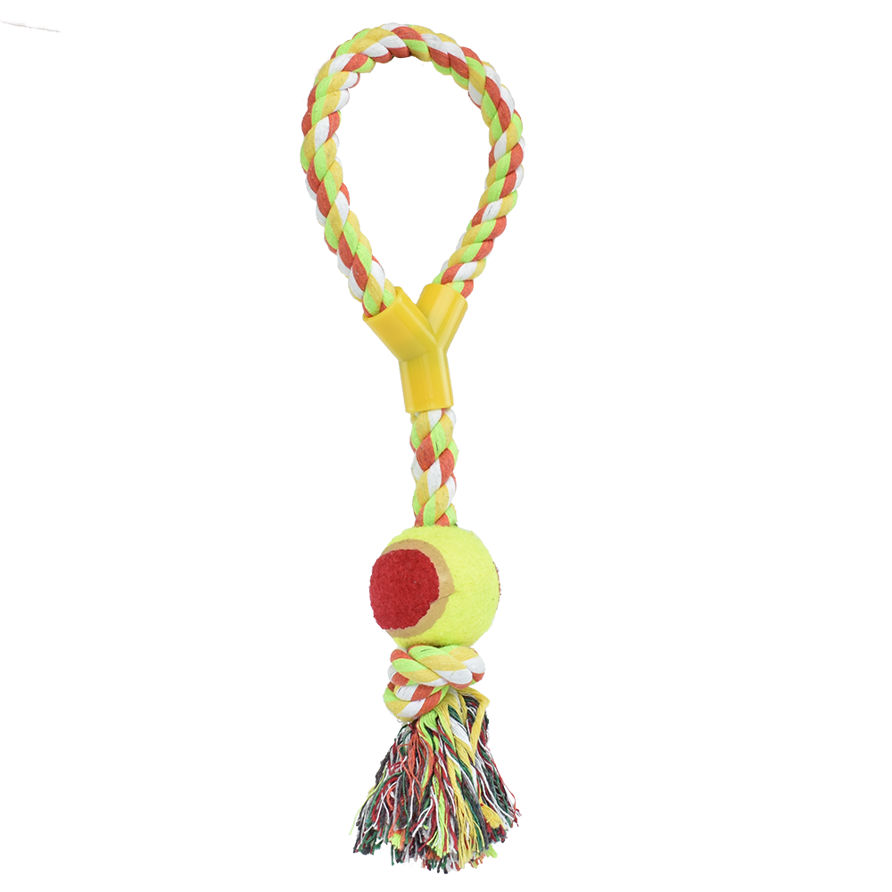 Aro de hilo de algodón multicolor, con pelota tipo tenis y extremo anudado. Fabricado de algodón que ejercita la mandíbula, fortalece las encías, limpia los dientes y entretiene a la mascota. Le permite interactuar con el perro, previniendo el estrés y el problema de mordisquear. Ventajas: