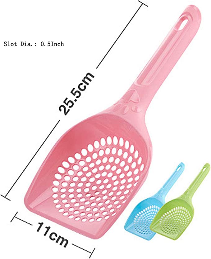 - La longitud total mide alrededor de 25,5 cm, 11 cm de ancho, tamaño perfecto para conseguir las esquinas y tomar las cucharas, haciendo que la limpieza de la caja de arena sea fácil.