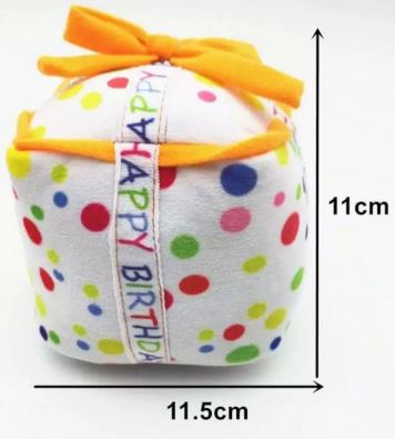 Adorable peluche con forma de regalo de cumpleaños sin sonido ideal para regalar en el cumpleaños de tu perro pequeño o toy.