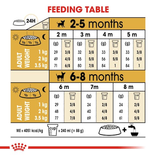 Chihuahua puppy satisface el apetito del Chihuahua gracias a la combinación de tres factores: una forma y tamaño de croqueta adaptados, una formulación exclusiva y aromas seleccionados.